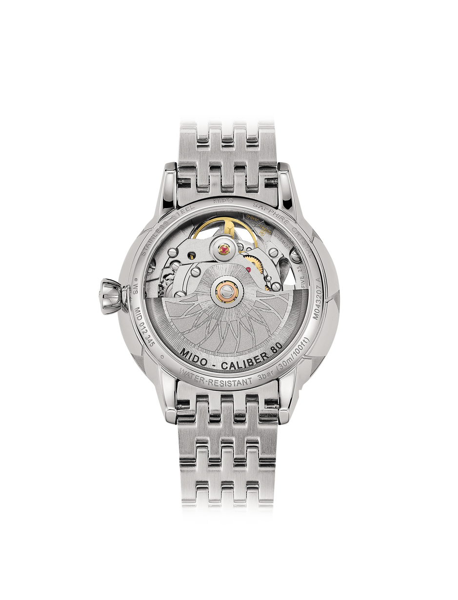 For the first time, Mido has created a skeleton Swiss watch especially dedicated to women. The new and audacious Rainflower Blossom features delicate lines, directly inspired by the lotus flower shape of Singapore’s contemporary ArtScience Museum. Resolutely feminine petals are interlaced along the edges. Adorned with an openwork flower, the captivating dial reveals at its centre the Caliber 80 – the latest-generation automatic movement, whose mainplate has been specially skeletonised and decorated. It invites the wearer to marvel at the passing of time with audacityand elegance.